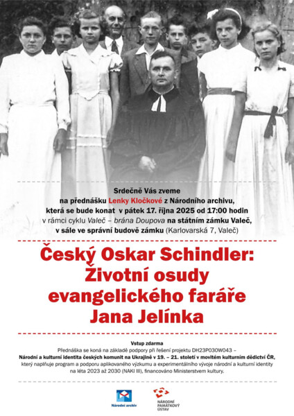 Náplň: PhDr. Lenka Kločková z Národního archivu nás detailně seznámí s inspirativním životním příběhem významné valečské postavy Jana Jelínka, který bývá za svou činnost právem nazýván českým Oskarem Schindlerem. Kromě jiných vyznamenání je Jan Jelínek nositelem Řádu Tomáše G. Masaryka a jednoho z nejvyšších polských řádů Virtus et Fraternitas.