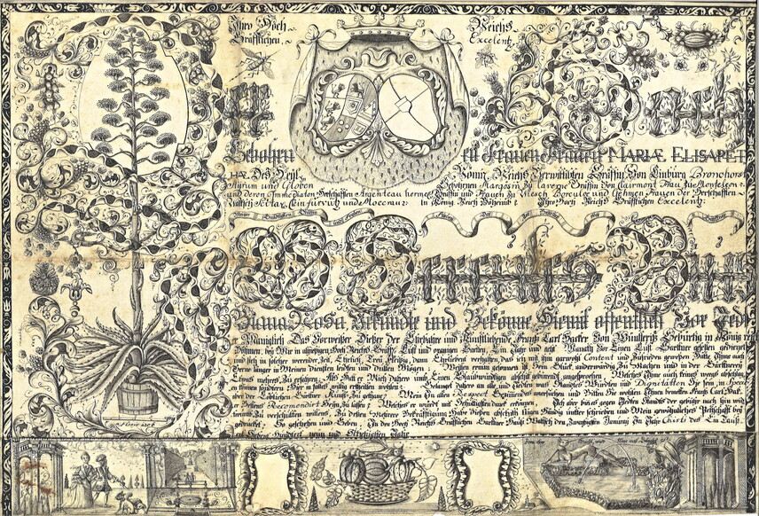 Listina je totiž navíc mimořádná i svým výtvarným provedením. Pergamen je bohatě zdoben alegorickými a botanickými motivy, které přímo odkazují na zahradnickou práci, pěstování exotických rostlin a význam zámecké zahrady jako reprezentativní součásti barokního sídla.